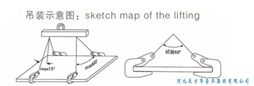 2.當(dāng)采用如圖所示進(jìn)行吊裝時(shí),必須降低載荷使用,一般規(guī)定β≤45°。在β=45°時(shí),橫吊起重鉗的起重載荷為原起重載荷的0.5倍,在β=30°時(shí),橫吊起重鉗的起重載荷為原起重載荷為0.75倍。